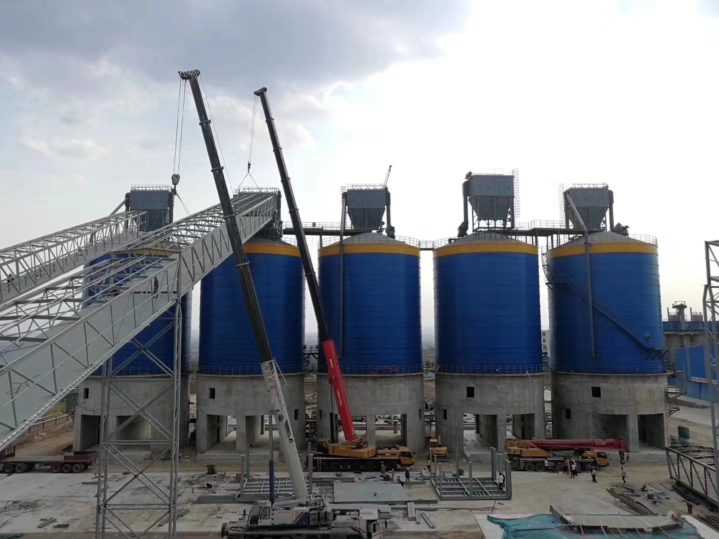 以柱支撐,能非常好的保證物料單調,3000噸骨料鋼板倉鋼板選用Q235B低合金錳板(東北區域選用Q345D添加強度與沖擊力)公司3000噸骨料鋼板倉方案以骨架為主。柱內灌溉混凝土添加鋼性(行進抗震、抗風才干)公司3000噸骨料鋼板庫房外選用環向槽鋼漲力圈,庫內選用豎向槽鋼抗風柱,焊接與庫體聯接選用翼板(保證質量和安全的條件下,行進鋼材的運用率,削減鋼材分量)3000噸骨料鋼板庫房頂選用栓聯接網架方案(庫頂全體受力均勻。